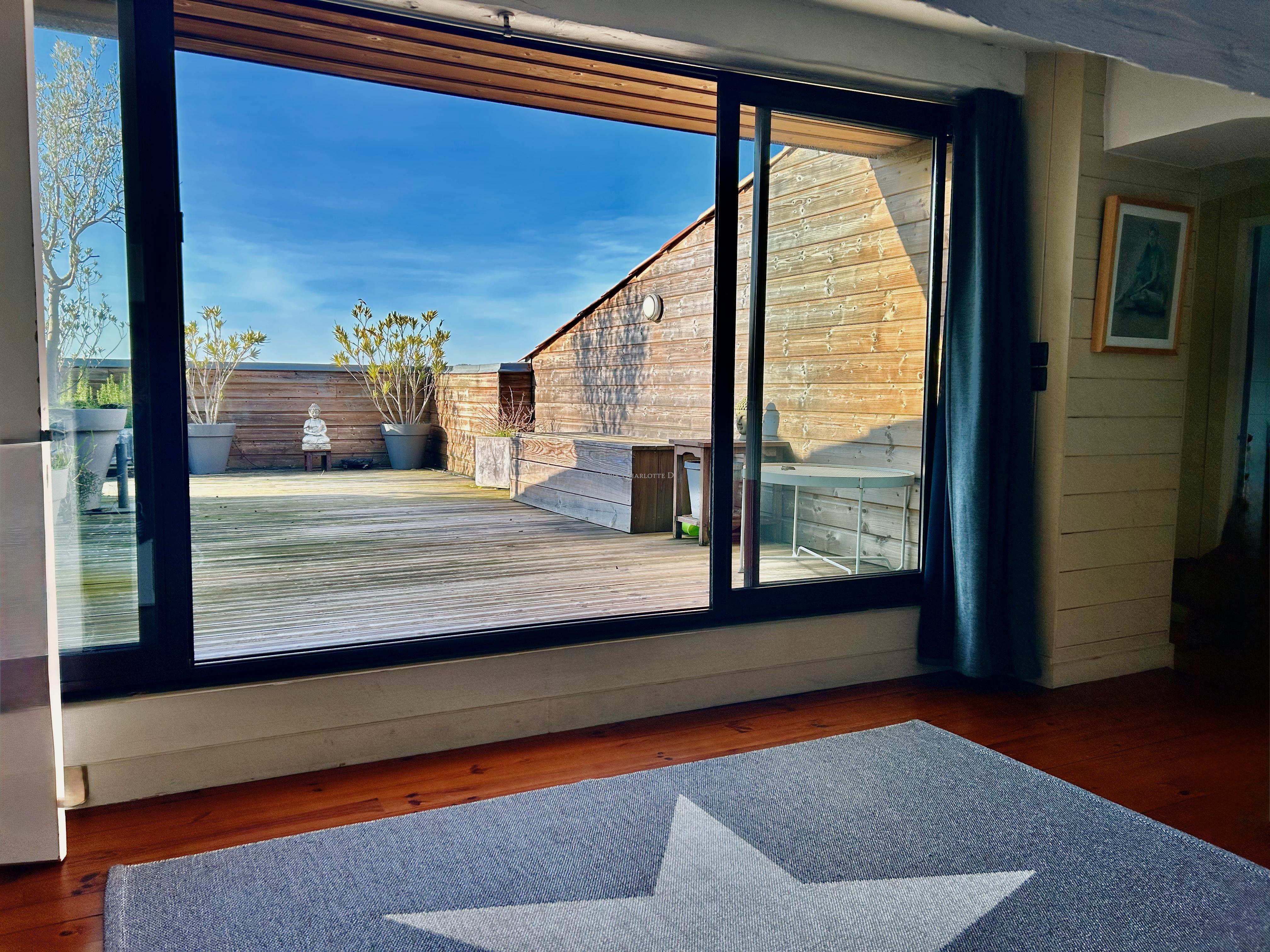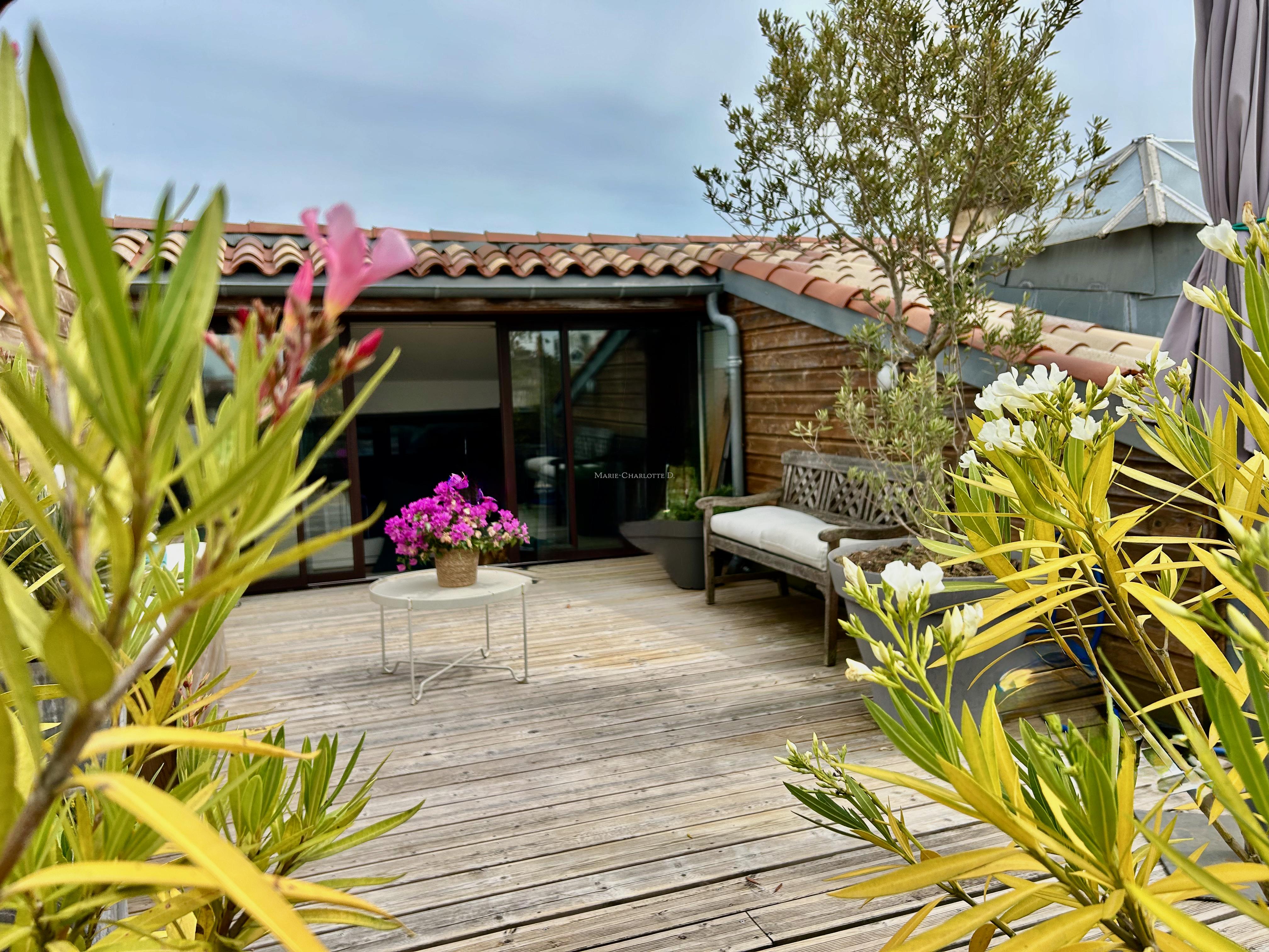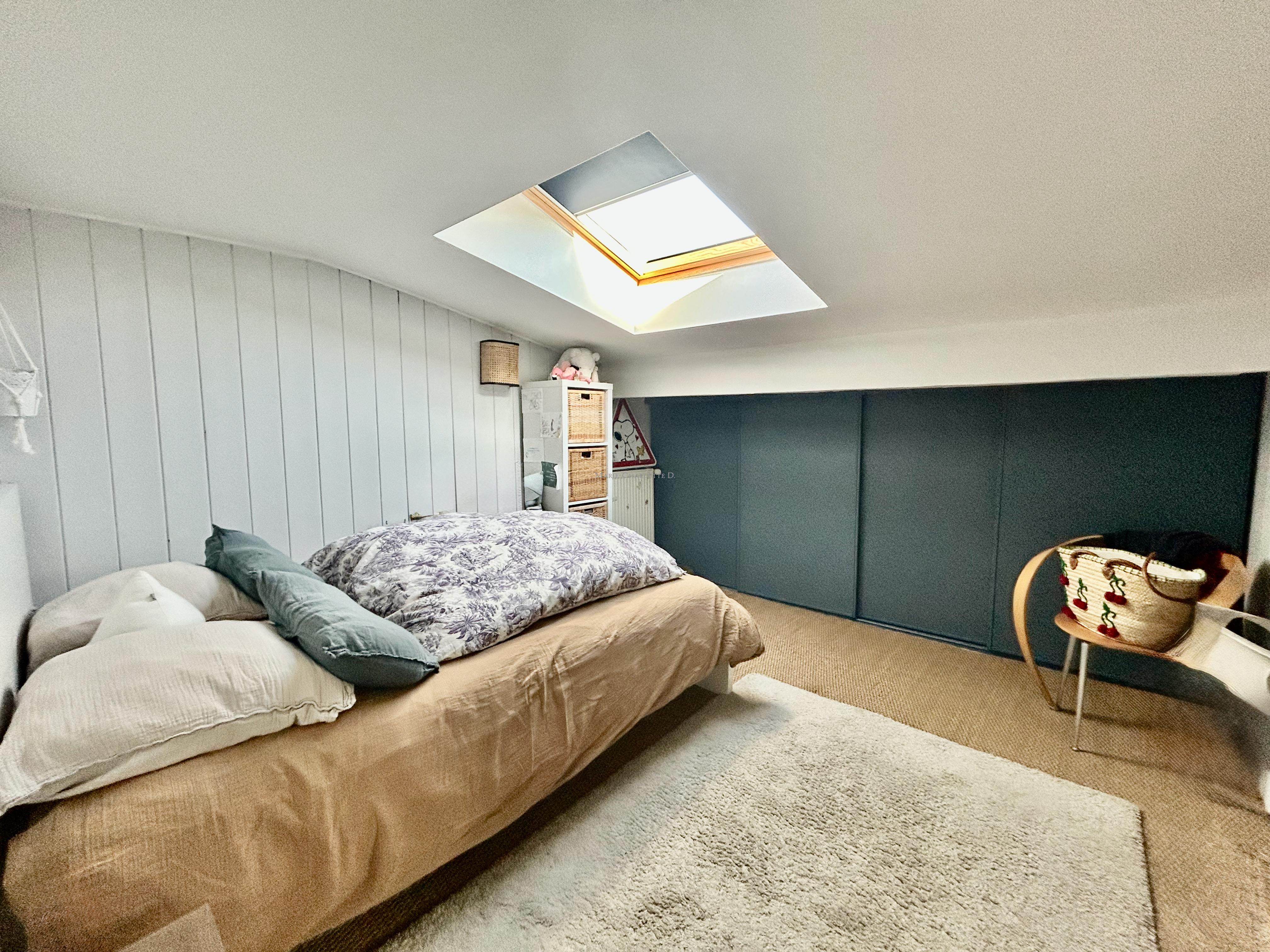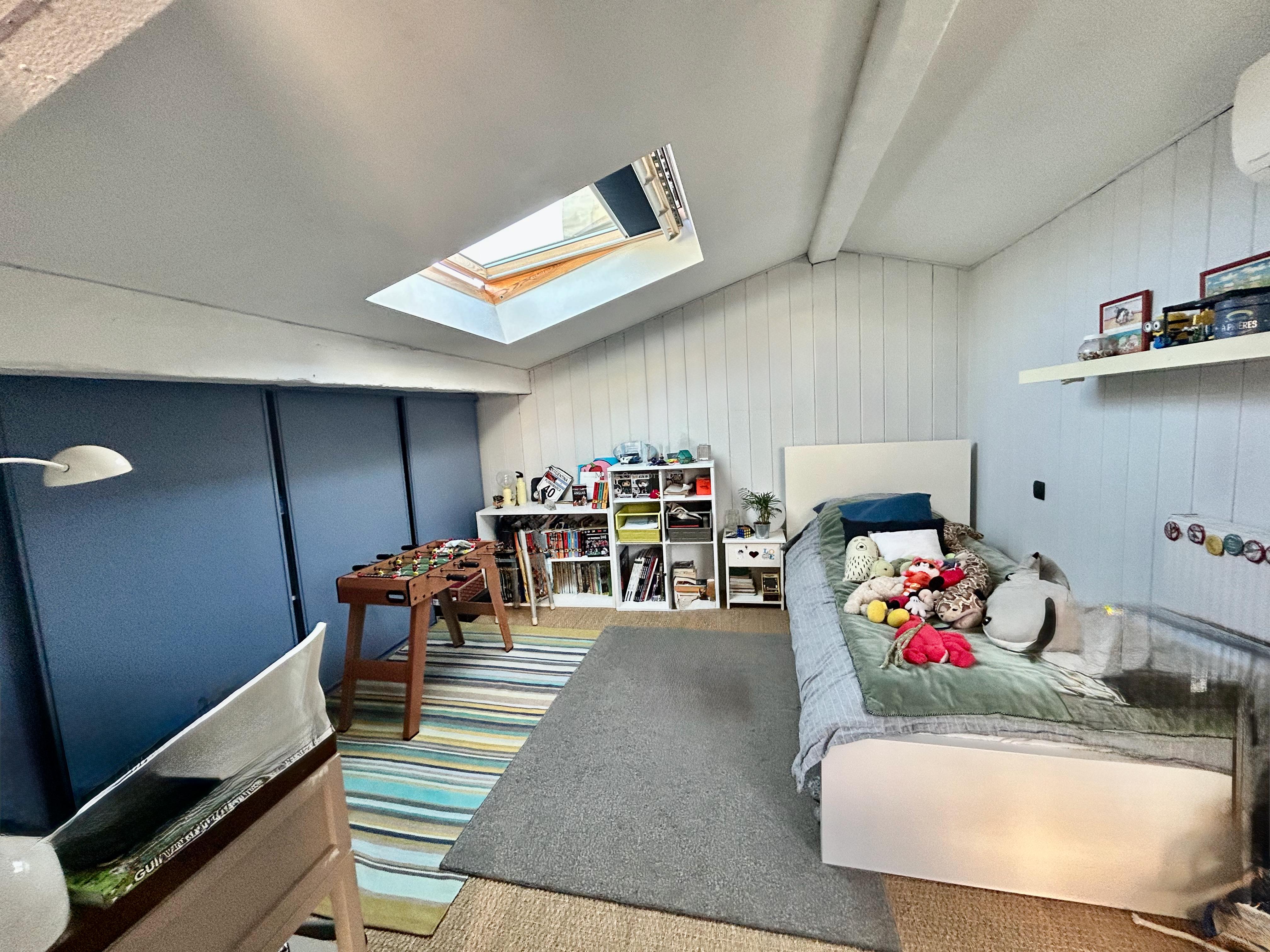À l’étage, l’appartement offre deux chambres sous pentes climatisées, une salle de bain et une salle de jeux ouverte sur une superbe terrasse plein Ouest de 40 m².